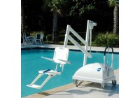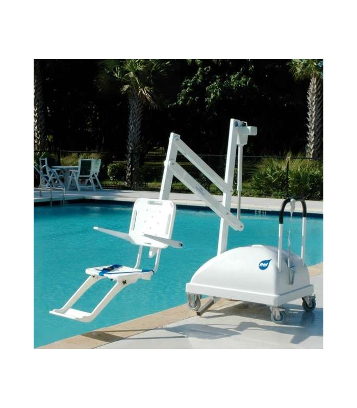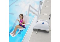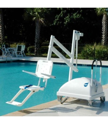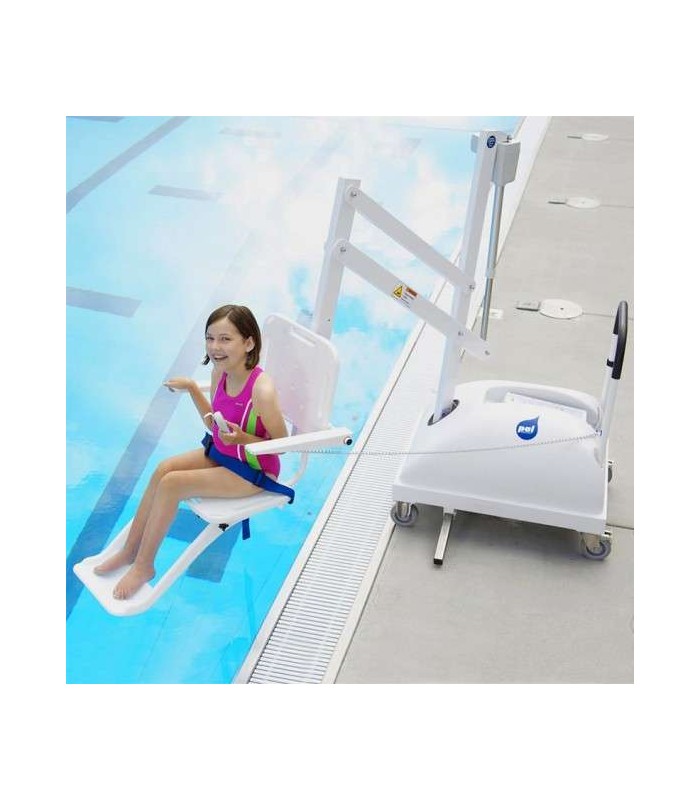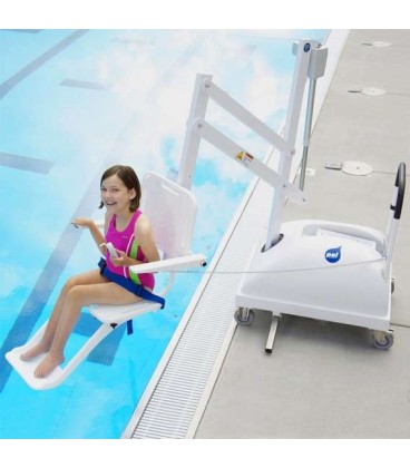 Silla portátil para minusválidos. No requiere de ningún tipo de montaje en la playa de la piscina. Su batería recargable de 24 V alimenta un actuador mecánico, asegurando que el equipo siempre esté listo para su uso. Duración 30 ciclos una vez cargada. Es la solución perfecta para instalaciones con varias piscinas ya que se puede colocar en cualquier lugar de la playa de la piscina y guardarla cuando se necesite. Mando de control resistente al agua. Fácil de utilizar incluso para el usuario final, se acerca la silla al borde de la piscina, se bloquean las ruedas, se pone el estabilizador y la silla esta lista para usarse. Estructura de materiales resistentes al agua para evitar la corrosión. Reposa brazos y reposa pies incluidos. La Pal se convierte en accesible a cualquier piscina en segundos. Es realmente el modo mas sencillo para que un minusválido acceda a la piscina.
