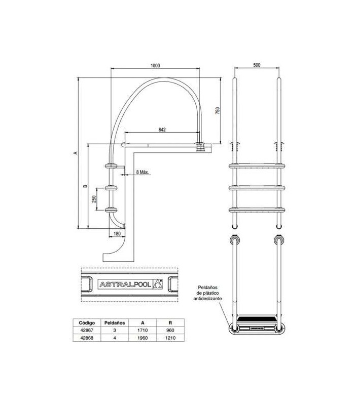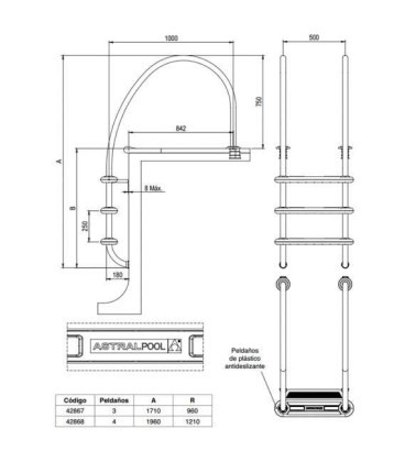 Escalera Komfort 1000 - 3 peldaños Astralpool. Nº referencia 42867. Escalera de tubo Inox AISI-316. Para piscinas residenciales y públicas con la innovación de un nuevo peldaño de plástico. El peldaño se ha fijado al pasamanos con un nuevo sistema que no necesita ningún tornillo. Los pasamanos en acero inoxidable, con ligero cambio de forma, modernos y estilizados. Peldaño con sistema sándwich. Tiene más superficie y su forma es más ergonómica que los peldaños tradicionales aportando más seguridad y comodidad que las escaleras convencionales. Estilo compacto, original y alegre. Concebida especialmente para piscinas con rebosadero.