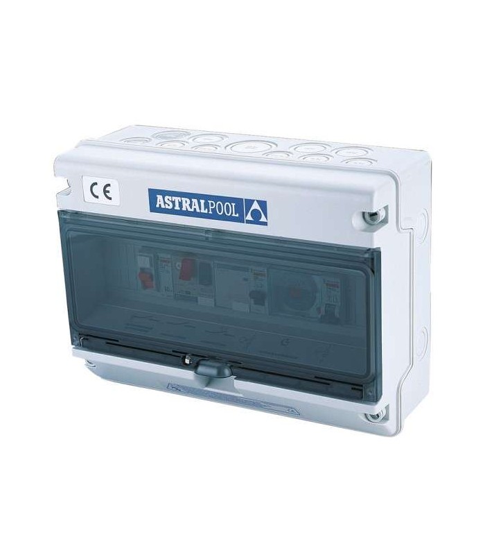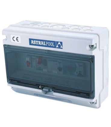 - Armario de maniobra AstralPool para la protección de 1 bomba + control de iluminación (sin transformador) con diferencial de protección trifásico (también disponible en versión monofásica, ver productos relacionados).