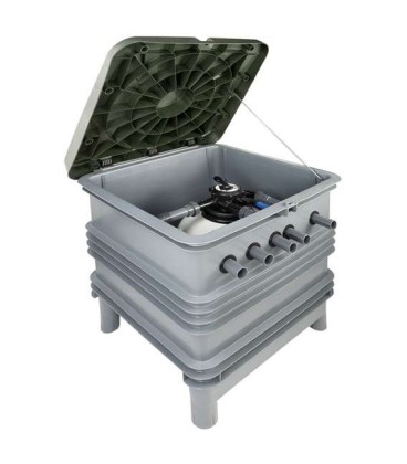 - Compacto para ir enterrado para piscina, formado por una caseta inyectada en polímero reforzado con fibra de vidrio y una tapa.