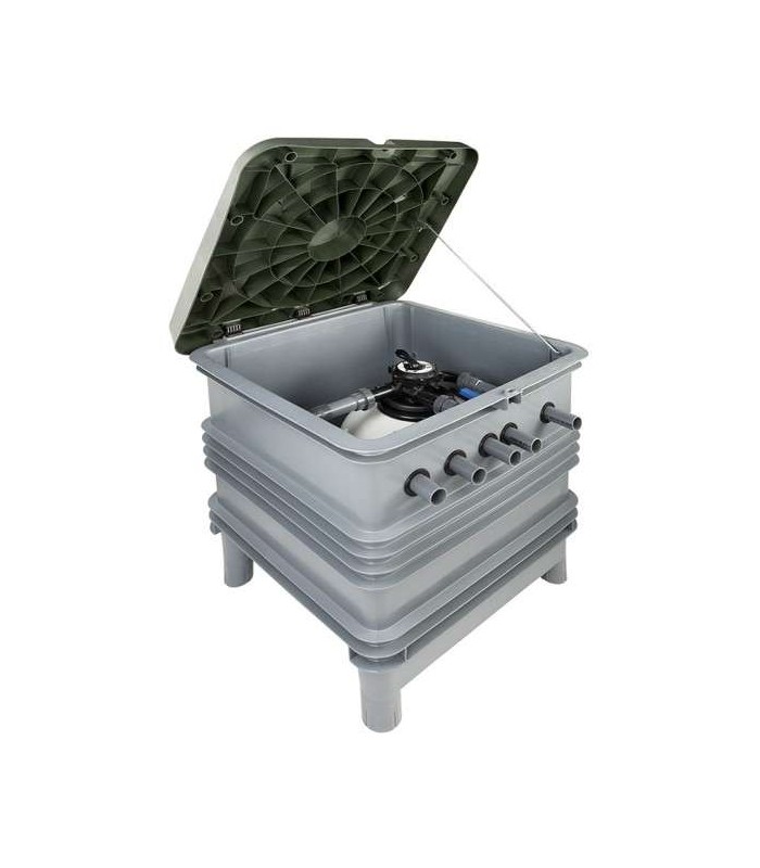 - En su interior alberga un filtro Aster de Ø 550 mm con válvula FLAT selectora manual TOP y una bomba de recirculación Sena de 1 CV.