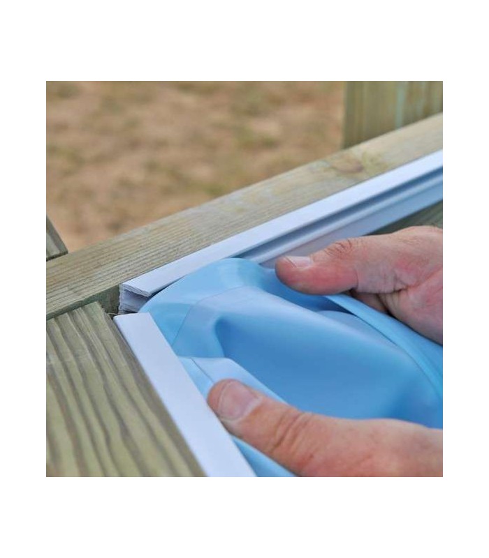 Tela de PVC para impermeabilización de la piscina elevada marca Gre, colocación mediante sistema colgante.