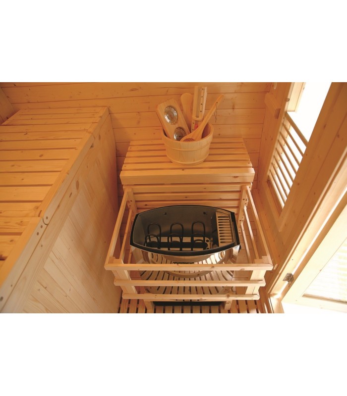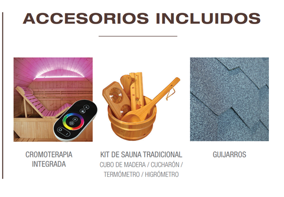 - Incluye Kit de Sauna Tradicional: cubo de madera, cucharón, termómetro e higrómetro.